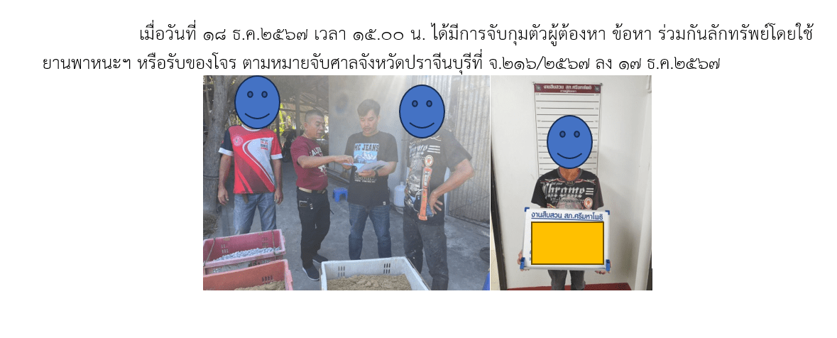 จับกุมตัวผู้ต้องหา ข้อหา ร่วมกันลักทรัพย์โดยใช้ยานพาหนะฯ หรือรับของโจร ตามหมายจับ
