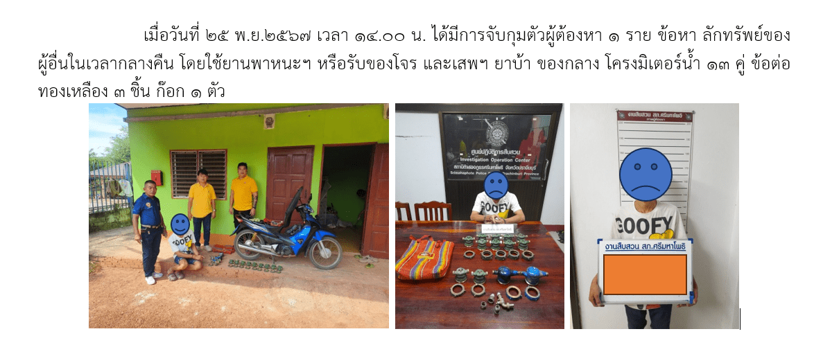 จับกุมตัวผู้ต้องหา 1 ราย ข้อหา ลักทรัพย์ของผู้อื่นในเวลากลางคืน โดยใช้ยานพาหนะฯ หรือรับของโจร