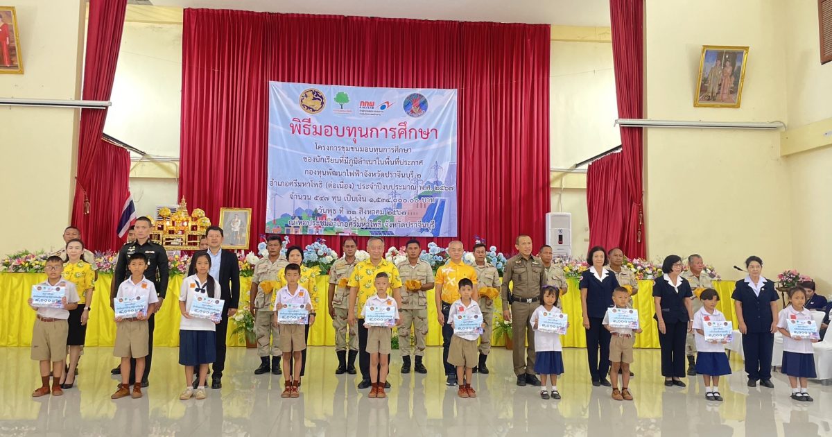 เป็นประธานในพิธีมอบทุนการศึกษา โครงการชุมชนมอบทุนการศึกษาของนักเรียนที่มีภูมิลำเนาในพื้นที่ประกาศกองทุนพัฒนาไฟฟ้าจังหวัดปราจีนบุรี 2 อำเภอศรีมหาโพธิ (ต่อเนื่อง) ประจำปีงบประมาณ พ.ศ.2567 จำนวน 547 ทุน เป็นเงิน 1,534,000 บาท