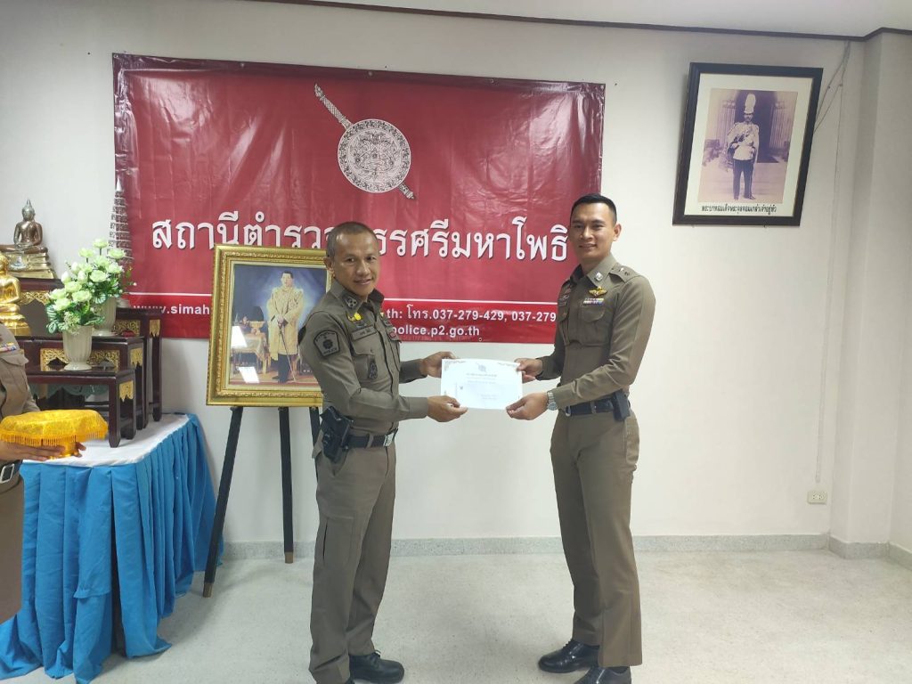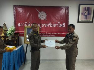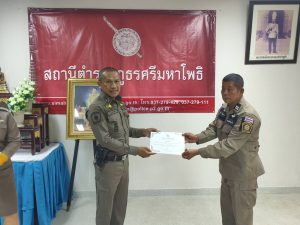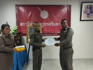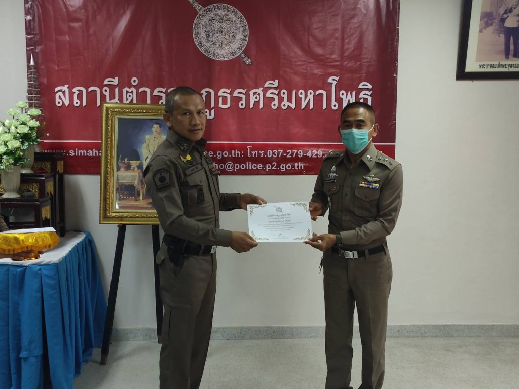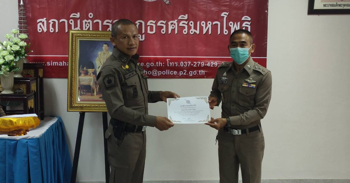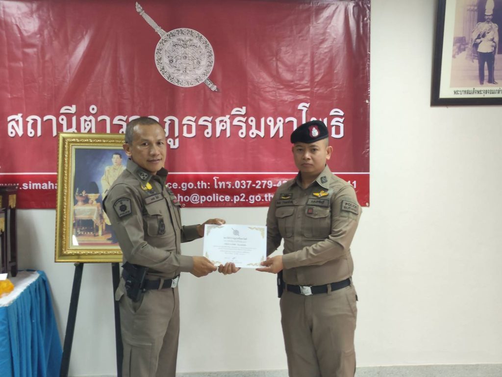 พ.ต.อ.มงคล โท้เป๋า ผกก.สภ.ศรีมหาโพธิ มอบใบประกาศเกียรติคุณและบำรุงขวัญกำลังใจ ให้แก่ข้าราชการตำรวจและอาสาสมัครตำรวจผู้ปฏิบัติหน้าที่อุทิศตนเสียสละและปฏิบัติหน้าที่ดีเด่น ดังนี้ – มอบใบประกาศเกียรติคุณให้ข้าราชการตำรวจ จำนวน 8 นาย