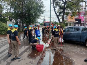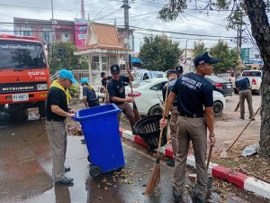 ข้าราชการตำรวจร่วมกันกวาดพื้น เก็บขยะ ใบไม้ และล้างทำความสะอาดพื้นที่ถนนบริเวณด้านหน้าและโดยรอบสถานี