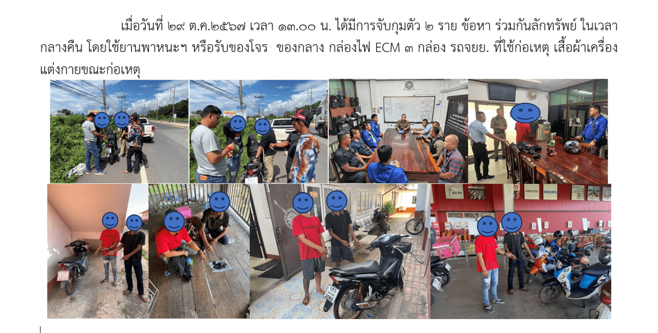 เมื่อวันที่ 29 ต.ค.2567 เวลา 13.00 น. ได้มีการจับกุมตัว 2 ราย ข้อหา ร่วมกันลักทรัพย์ ในเวลากลางคืน โดยใช้ยานพาหนะฯ หรือรับของโจร