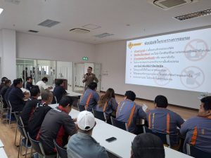 วิทยากรให้ความรู้ ขับขี่ปลอดภัย ใส่ใจกฎจราจรและการขับขี่อย่างถูกต้องตามกฎหมาย เพื่อปลูกฝังจิตสำนึก ด้านความปลอดภัย กับพนักงานขับรถรับ-ส่งของบริษัทแคนนอน ปราจีนบุรี