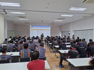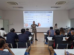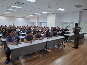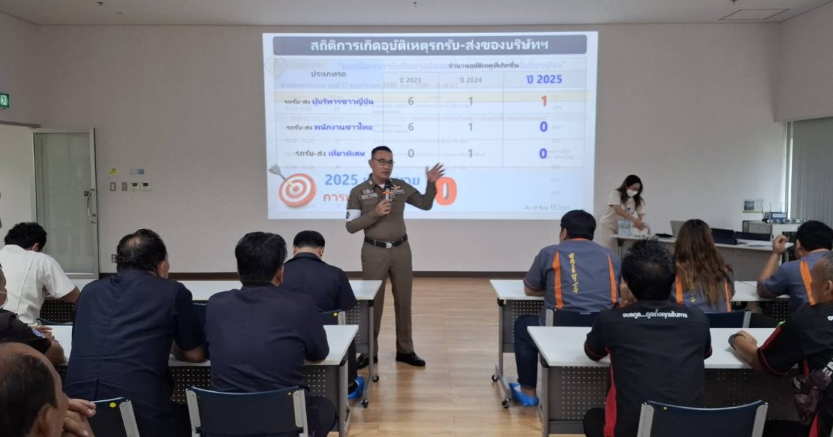 วิทยากรให้ความรู้ ขับขี่ปลอดภัย ใส่ใจกฎจราจรและการขับขี่อย่างถูกต้องตามกฎหมาย เพื่อปลูกฝังจิตสำนึก ด้านความปลอดภัย กับพนักงานขับรถรับ-ส่งของบริษัทแคนนอน ปราจีนบุรี