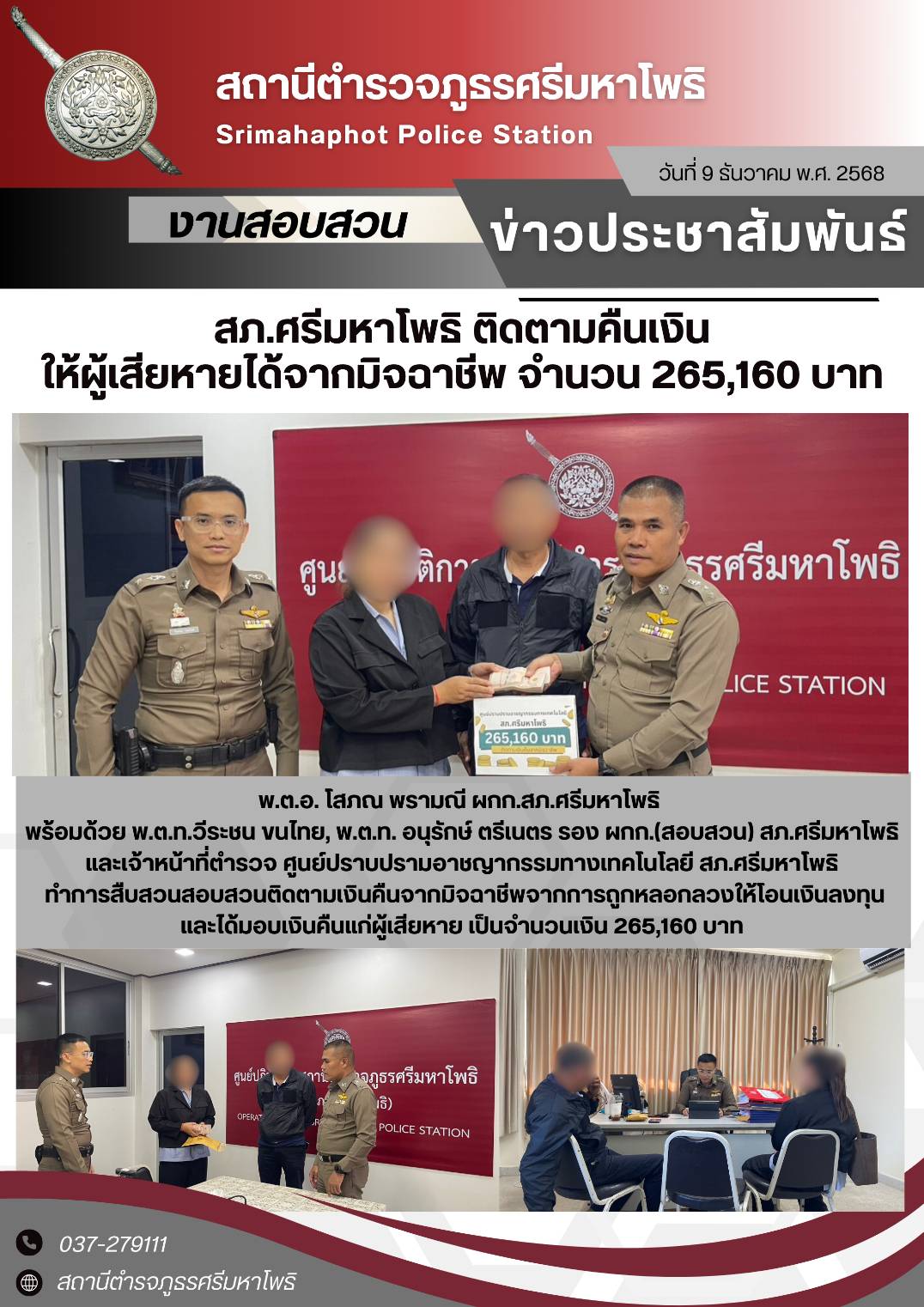 วันที่ 9 ธ.ค. 2568 พ.ต.อ. โสภณ พรามณี ผกก.สภ.ศรีมหาโพธิ พ.ต.ท.วีระชน ขนไทย รอง ผกก.(สอบสวน) สภ.ศรี